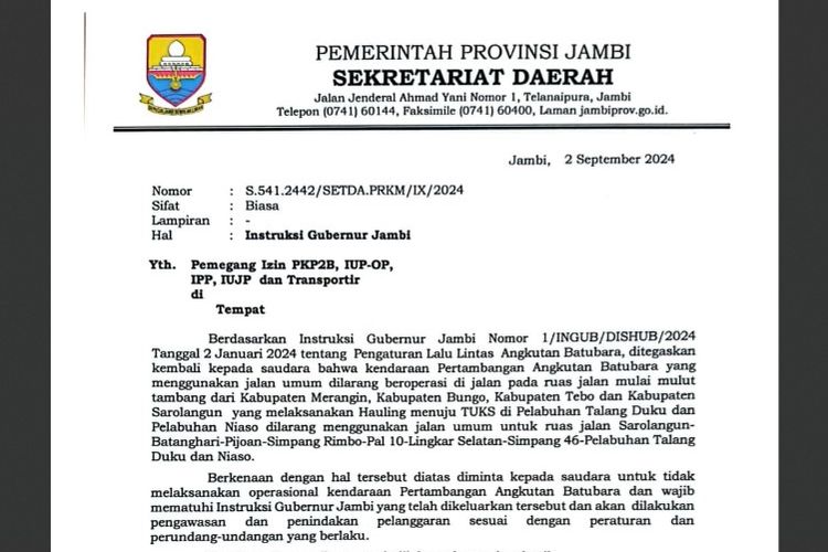 Pengumuman yang ditujukan kepada pemegang IUP, Ketua PPTB Jambi, Pemilik TUKS/TELSUS dan pemilik usaha tongkang itu tertuang dalam surat nomor S.450/1354/SETDA.PRKM-2.2/V/2024 tanggal 29 Mei 2024.